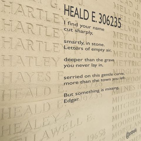 When I started writing my last piece, in France, I had a narrow topic in mind and a clear thesis I wanted to explore, but promptly got derailed by the nonsense in a supermarket. I had visited one of the many Commonwealth War Graves Commission Memorials in northern France, at Arras, where my great uncle Edgar is commemorated on a huge six-bay Lutyens designed monument alongside the names of almost 35,000 other servicemen who died in that region in just a a couple of years with no known grave. I didn’t write about it at the time, but I did write a short poem back at home.